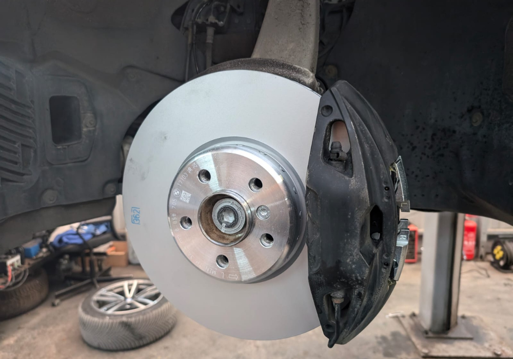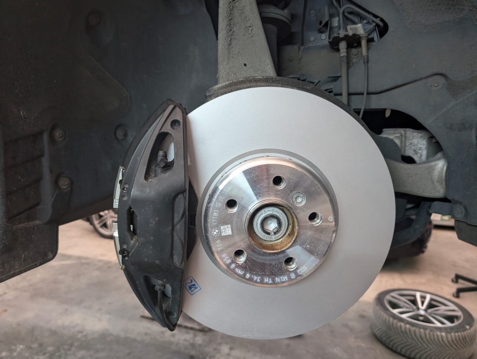 Tarcze hamulcowe przód BMW OE, klocki przód BMW OE, sprężyny przednich zacisków BMW OE, czujnik przód Brembo