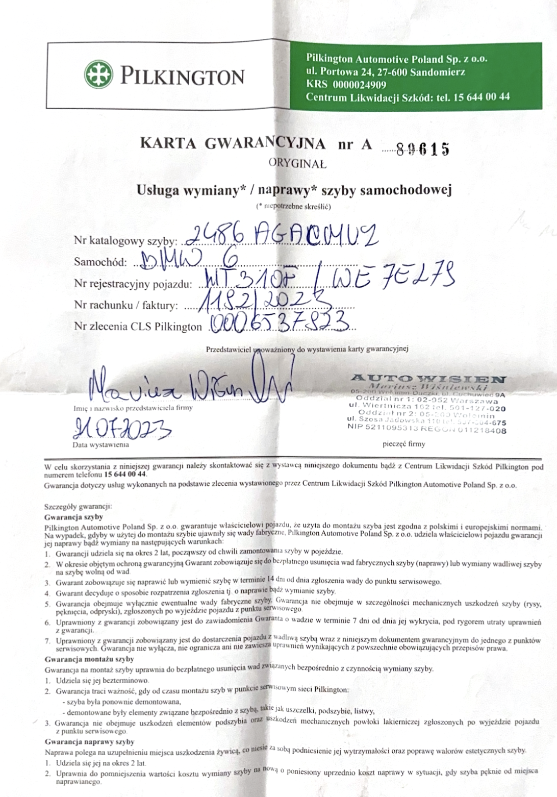 Wymiana szyby czołowej Pilkington + kalibracja kamer